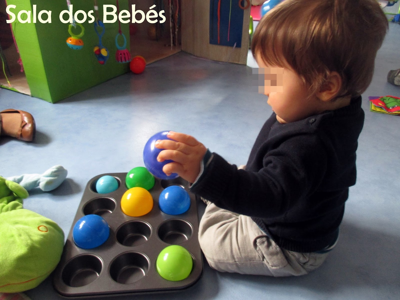 Ultimamente os bebés têm mostrado cada vez mais vontade em explorar novos materiais, de variadíssimas formas. Tentando responder a esta vontade, apresentámos-lhes uns tabuleiros de cozinha, com espaços redondos (formas para queques) onde encaixavam várias bolas de tamanhos, cores,sons e texturas diferentes.